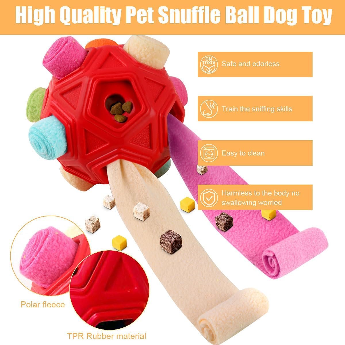 • [High Quality Safe Material] The dog snuffle ball is made of durable, safe and non-toxic comfortable shaker fleece fabric and TPR rubber. The special design and safe materials make it is very suitable for your dog game or feeding without any safety concerns for long time use.
