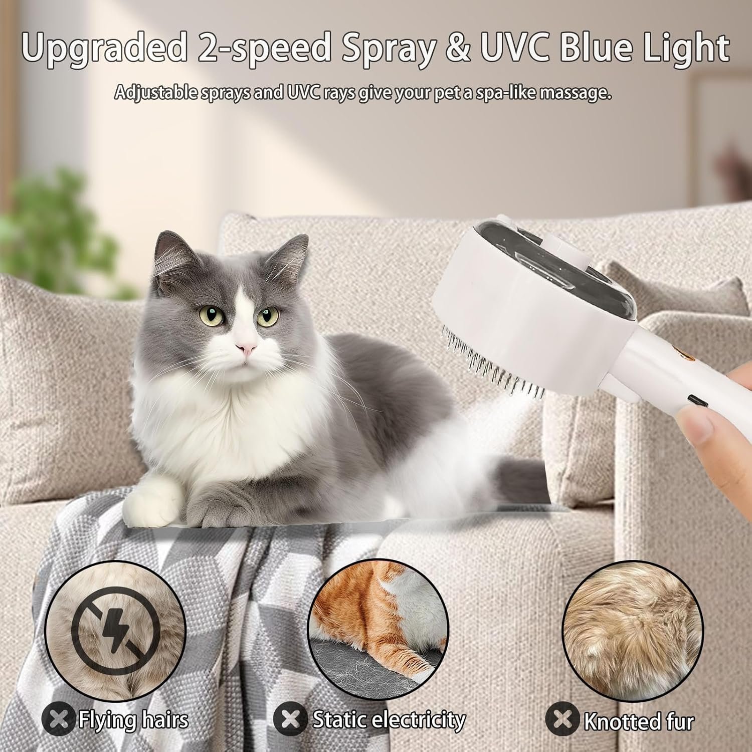 • 【Versatile & Easy to Use】:The pet grooming brush has 140° curved needles designed to make it easier to groom your pet’s undercoat well. Metal button short press to change the spray speed, long press to turn on the UV light, it is a multi-functional grooming tool that combines cleaning, brushing, spraying and de-shedding