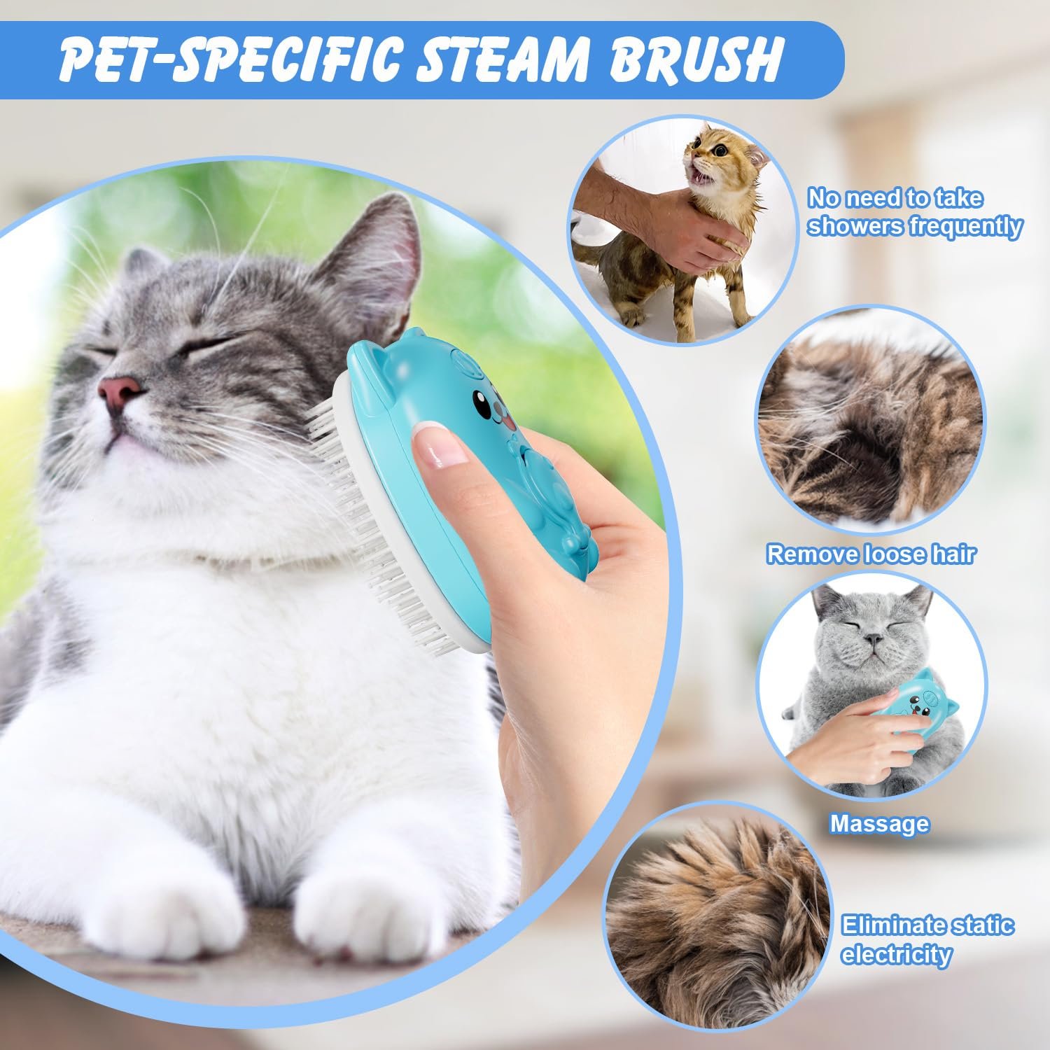 • 【Upgraded 3 in 1 CAT STEAM BRUSH】Remove loose hair, clean coat, reduce shedding, and keep your pet’s coat sleek, smooth and looking nice. The cat brush with steam can effectively remove surface dirt and shedding fur, provide gentle grooming massage, reduce the frequency of bathing especially for the cats who dislike water.